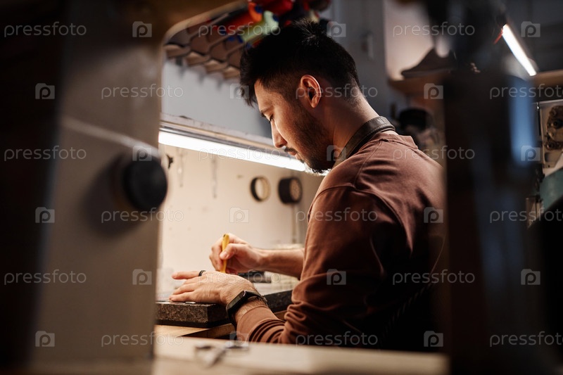 Боковой вид молодого азиатского мужчины-обувника, сидящего у рабочего места