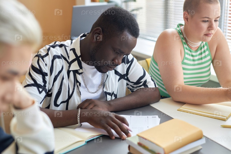 Серьезный афроамериканский парень, просматривающий бумаги с тестовыми вопросами