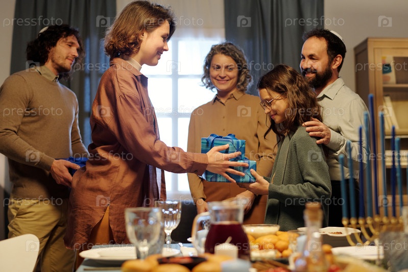 Счастливая молодая брюнетка-женщина пропускает упакованную коробку с подарками юной девушке