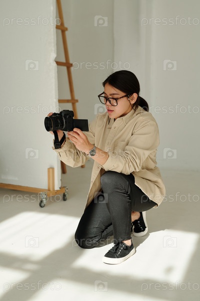 Молодая женщина с фотоаппаратом смотрит на экран во время фотосессии