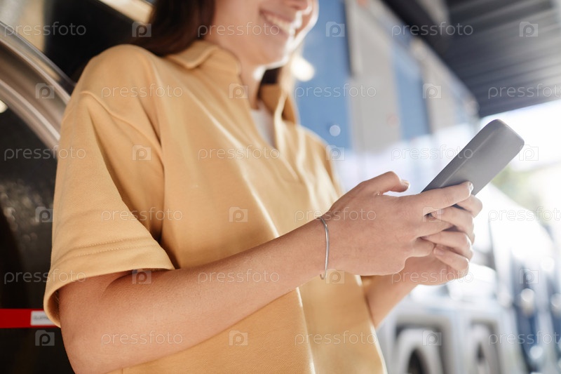 Сосредоточьтесь на руках молодой женщины-клиентки кафе стирки с мобильным телефоном