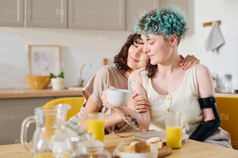 Молодая брюнетка обнимает подругу с помощью миоэлектрической руки, выпивая чай