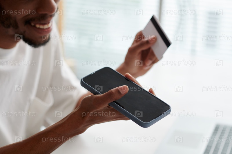 Рука счастливого молодого афроамериканца с мобильным телефоном
