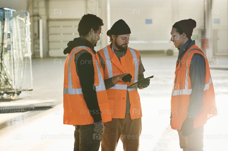 Два молодых мультиэтнических мужчины слушают своего бригадира с планшетом на встрече