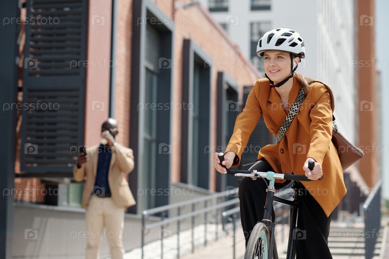 Молодая веселая женщина-сольопредприниматель в шлеме безопасности едет домой с работы