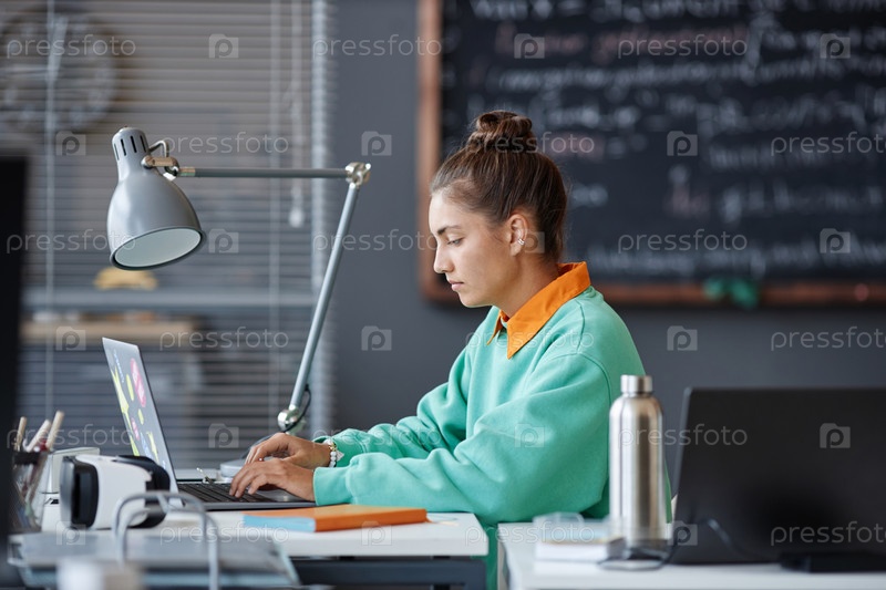 Женщина печатает на ноутбуке в офисе