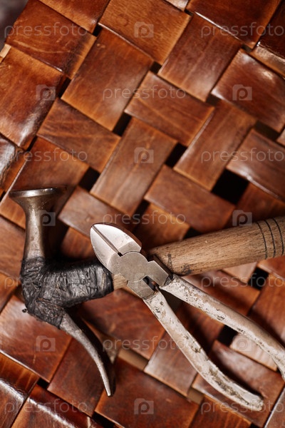 Выше вид на часть коричневого плетеного стула и комплект ручных инструментов