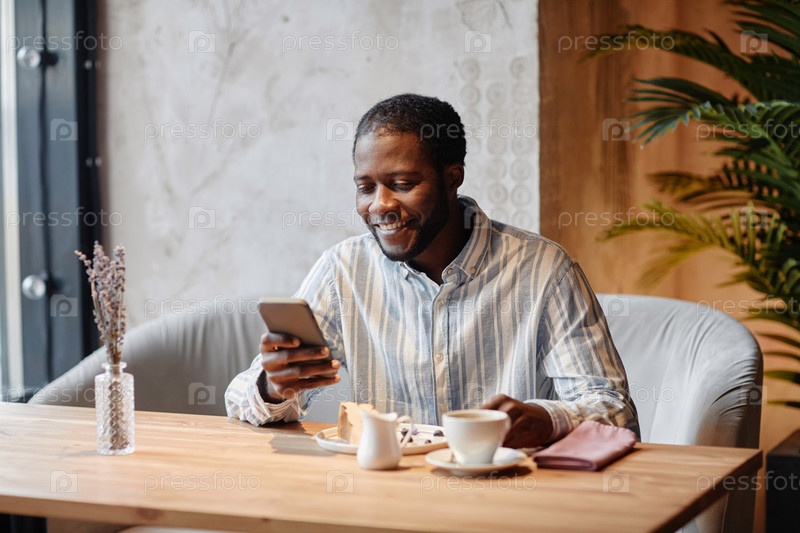 Молодой улыбающийся афроамериканский менеджер смотрит на экран смартфона