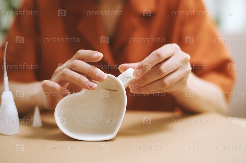 Руки женщины приклеивают рукоятку к кофейной чашке в форме сердца