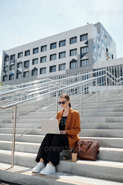 Длинный снимок молодой современной деловой женщины с сетью ноутбука на лестнице