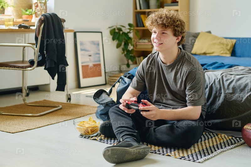 Подросток с кудрявыми волосами сидит на полу возле кровати и играет в видеоигры