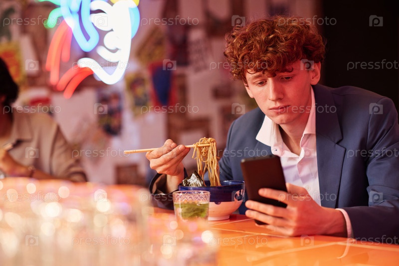 Загруженный молодой человек в формальной одежде смотрит на экран смартфона во время обеденного перерыва