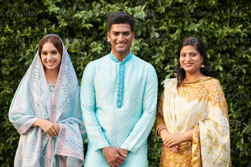Группа положительных индийских людей в традиционных костюмах, посещающих вечеринку