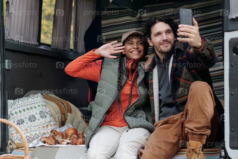 Счастливые молодые межкультурные блогеры приветствуют онлайн-аудиторию или делают селфи
