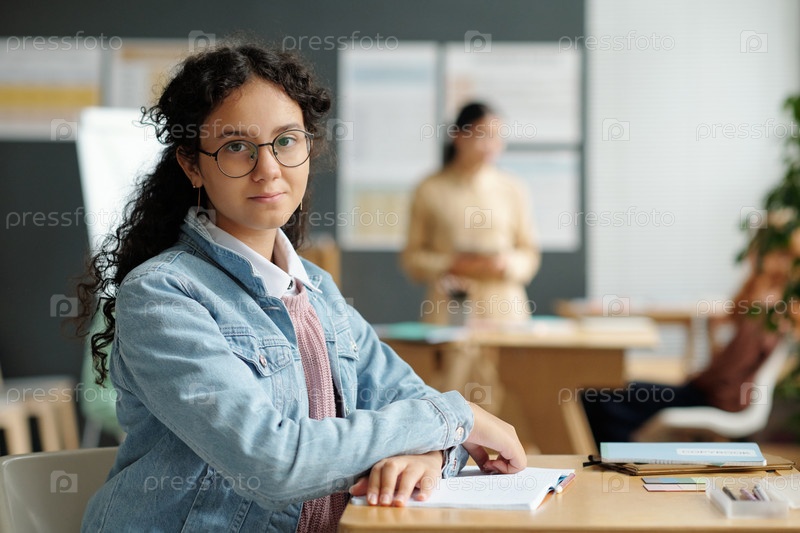 Молодая серьезная многонациональная школьница в очках и джинсовой куртке