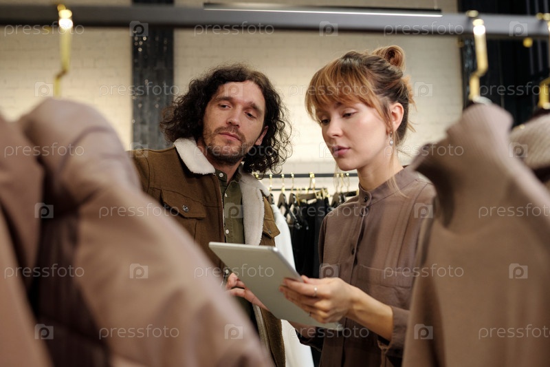 Молодая продавщица использует планшет во время консультации с клиентом-мужчиной