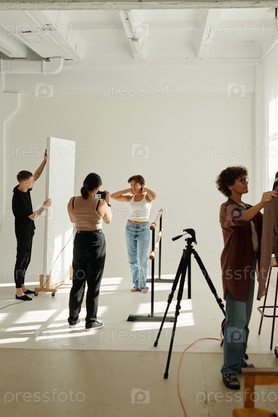 Съемочная группа молодых профессионалов, работающих во время фотосессии в студии