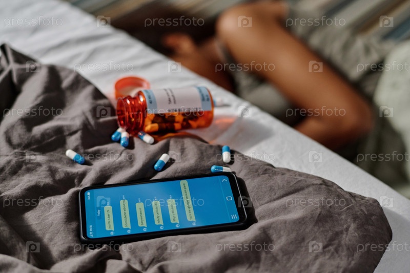 Смартфон с сообщениями о киберзапугивании на экране и разбросанными таблетками