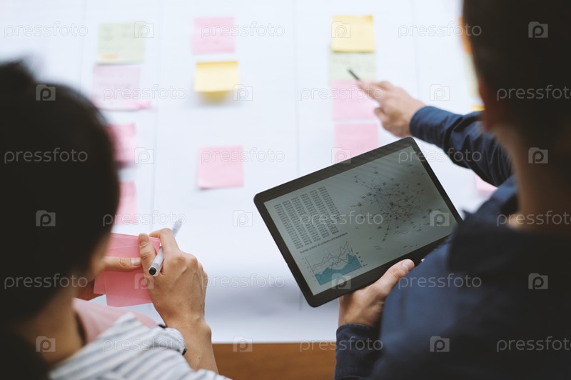 Таблетный компьютер с диаграммой рассеивания в руках бизнесмена, разговаривающего с коллегой на встрече