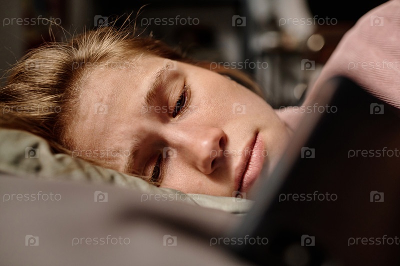 Сосредоточьтесь на лице стрессовой девочки-подростка, лежащей на подушке и использующей смартфон