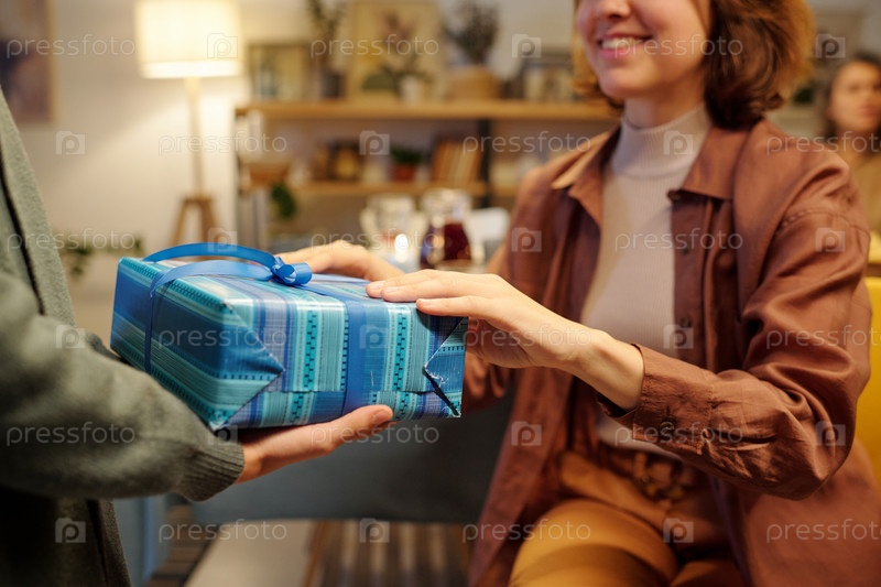 Близкий план счастливой молодой женщины, держащей руки на верхней части упакованной подарочной коробки