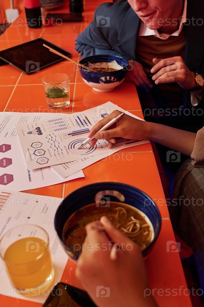 Рука молодой бизнес-жены, указывающей на финансовый документ с графическими данными