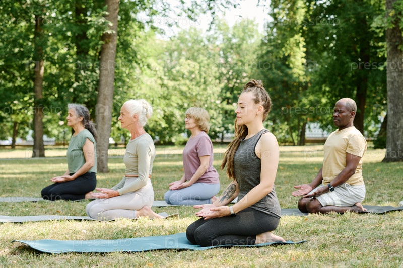 Тренер медитирует вместе со старшими людьми