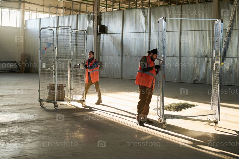 Длинный снимок двух молодых инженеров-мужчин в рабочей одежде, толкающих и ремонтирующих тележки