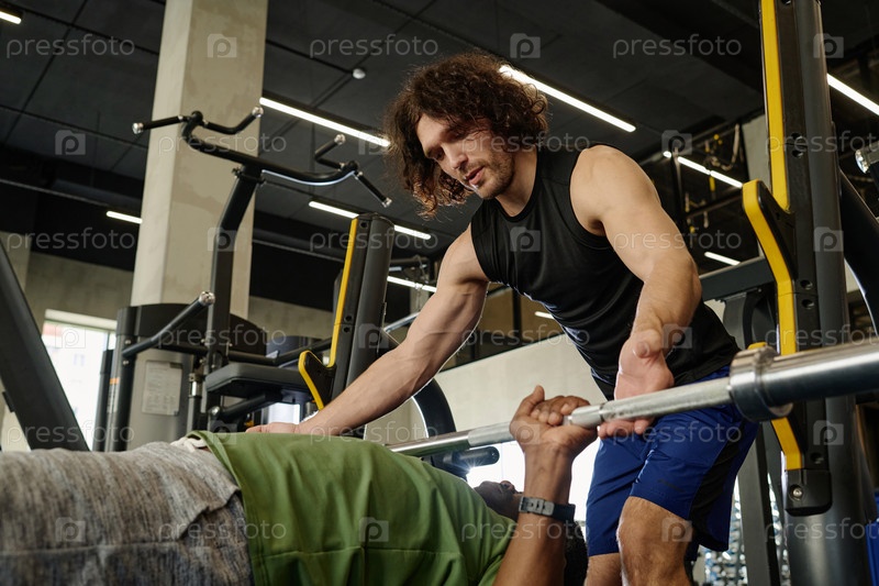 Тренер работает со своим клиентом над поднятием штанги