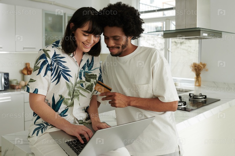 Молодой человек с кредитной картой стоит рядом со своей женой, печатая на клавиатуре ноутбука