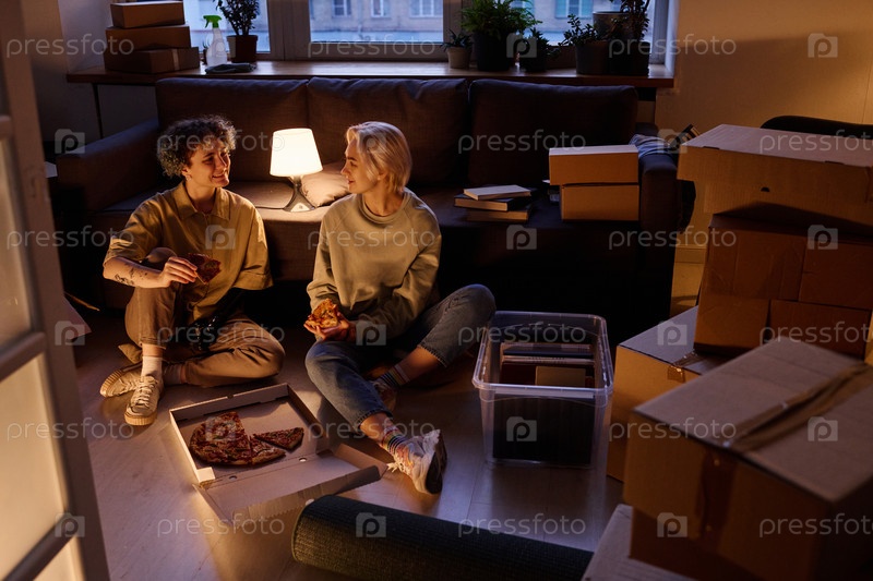 Лесбиянская пара ест пиццу дома