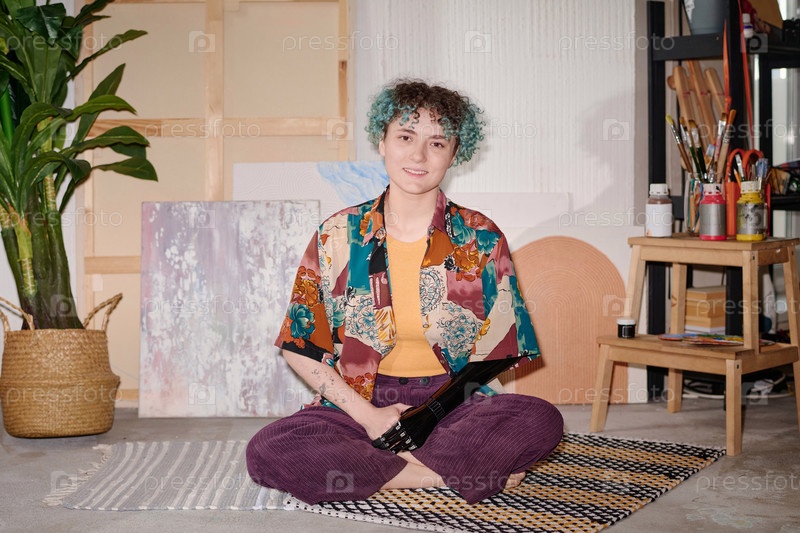 Портрет улыбающегося художника с протезированной рукой, сидящего на полу в студии