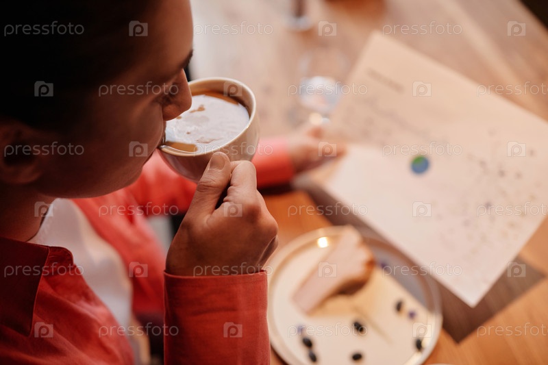 Близкий план молодой занятой женщины-экономиста, пьющей капучино в кафе