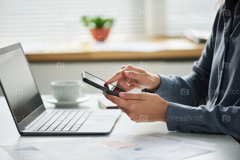 Боковой вид рук молодой бизнес-жены, указывающей на экран смартфона