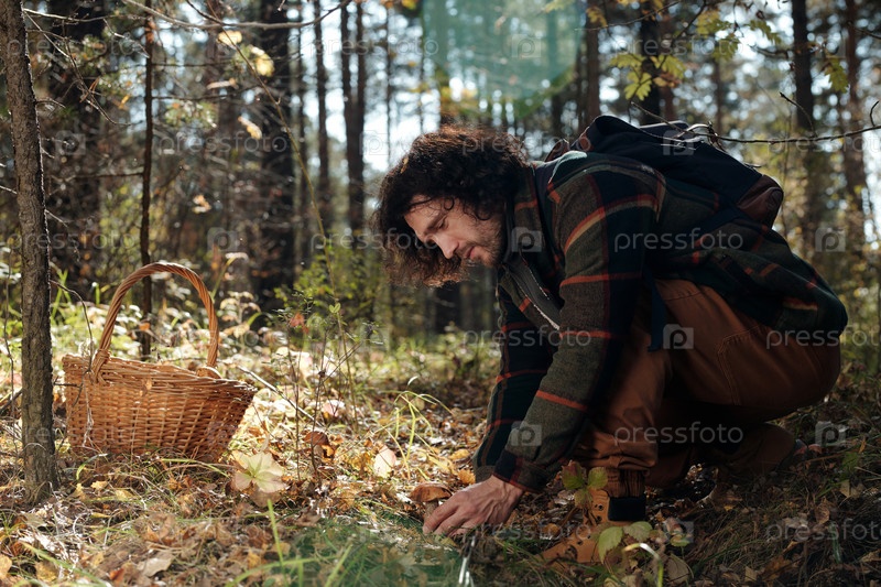 Боковой вид молодого мужского рюкзаковщика, режущего свежий boletus ножом