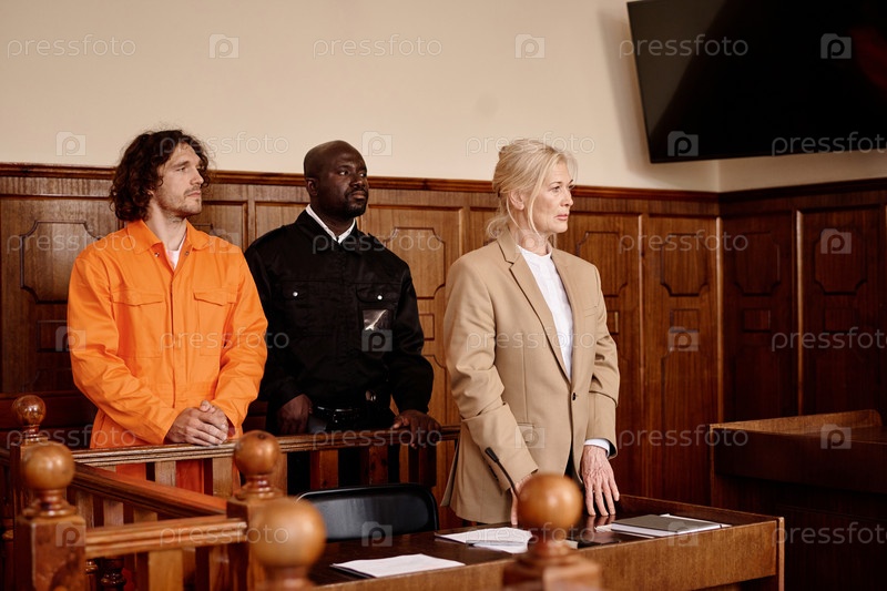 Молодой афроамериканский полицейский, стоящий между заключенным и адвокатом
