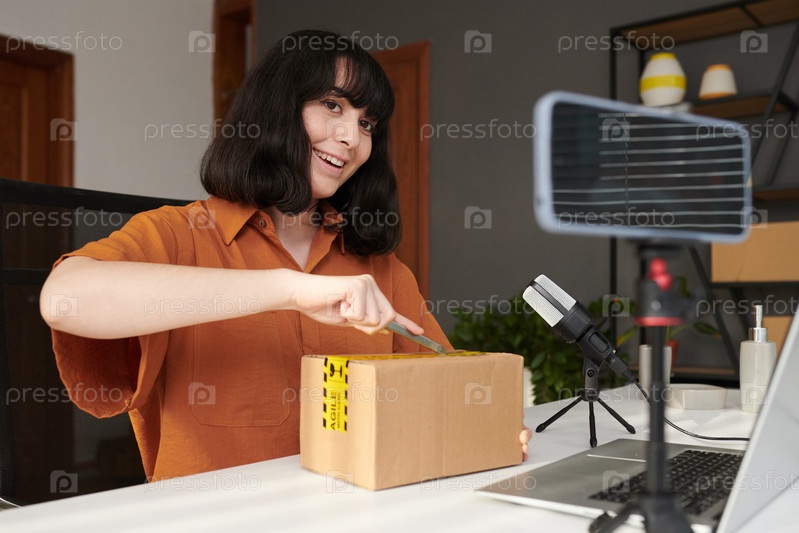 Счастливая молодая брюнетка, режущая посылку острым ножом
