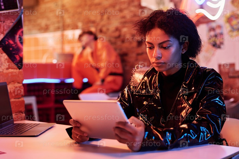 Серьезная афроамериканская девушка в черной куртке смотрит на экран планшета