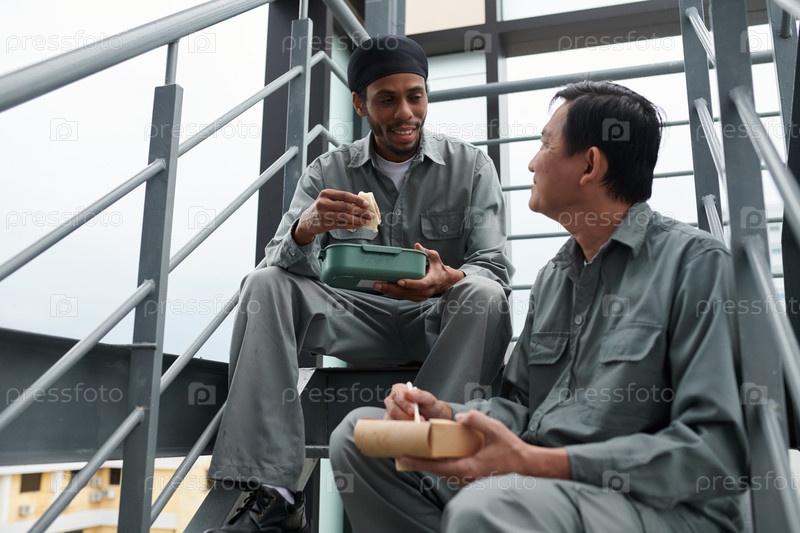 Строительные рабочие едят на стройке