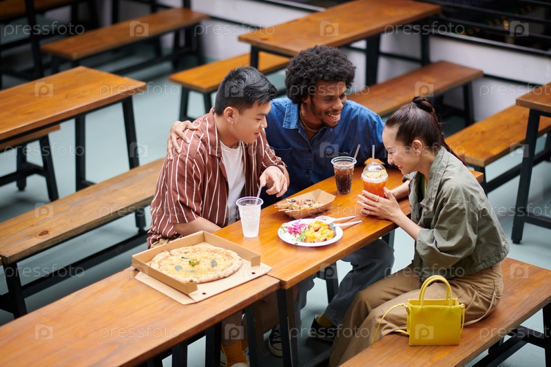 Друзья, имеющие пиццу и напитки