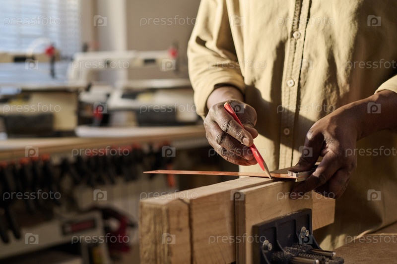 Ближайшее изображение старшего плотника, тщательно измеряющего древесину в мастерской
