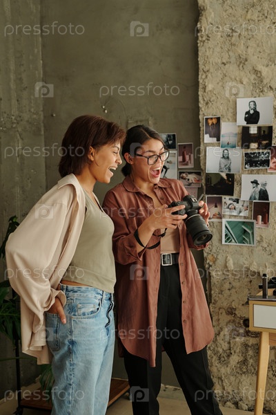 Веселая молодая модель и фотограф, смотрящая на новые фотографии