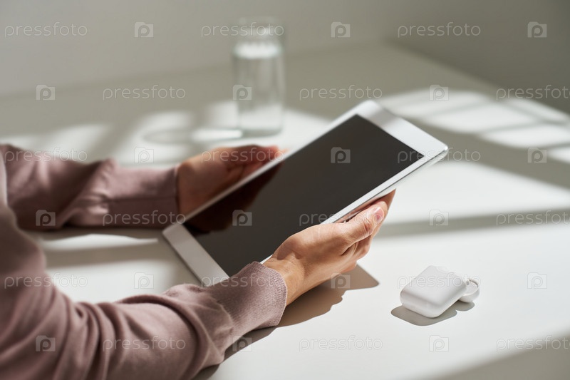 Близкий план молодой женщины в бежевом пуловере, держащей таблетку с пустым экраном