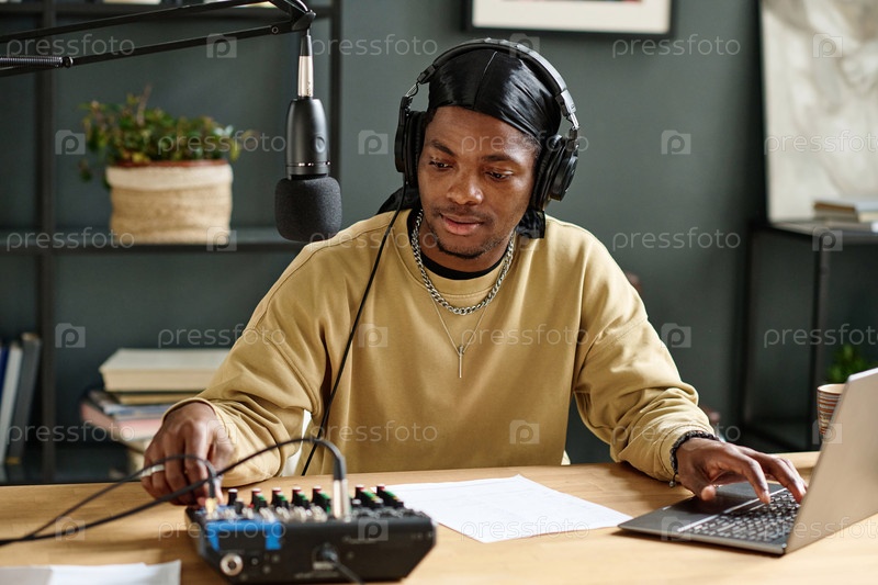 Африканский американец в наушниках, переключающий консоли на звуковую плату