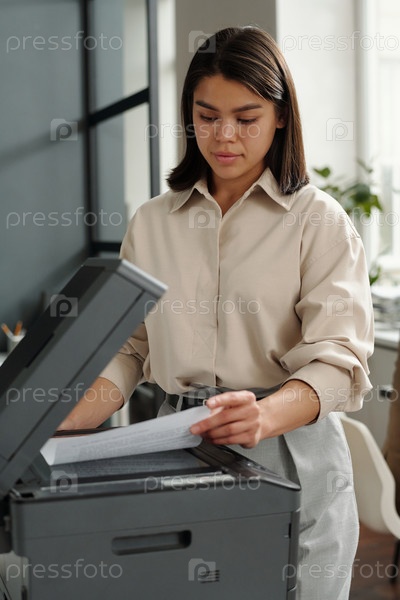 Молодая женщина-менеджер офиса стоит у ксерококса, копируя документ