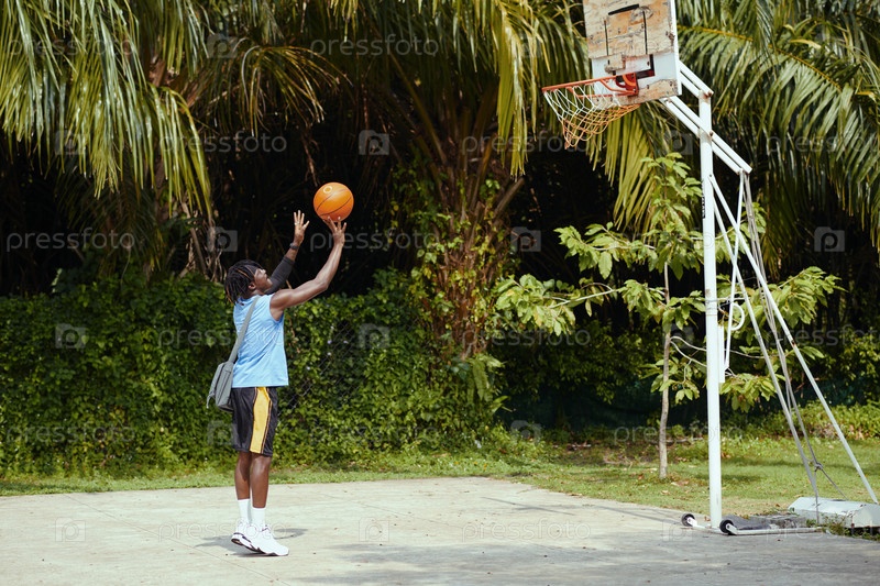 Чернокожий бросает мяч в корзину