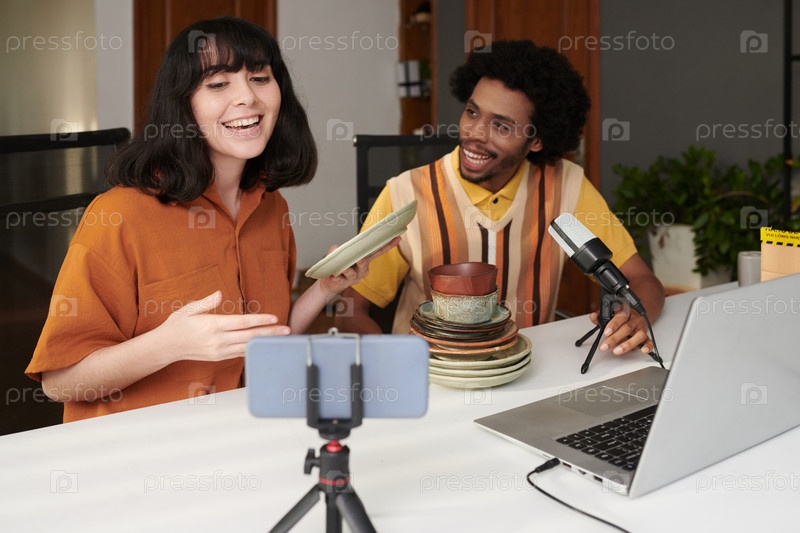 Счастливая молодая блогерша с глиняными сосудами, говорящая онлайн-аудитории
