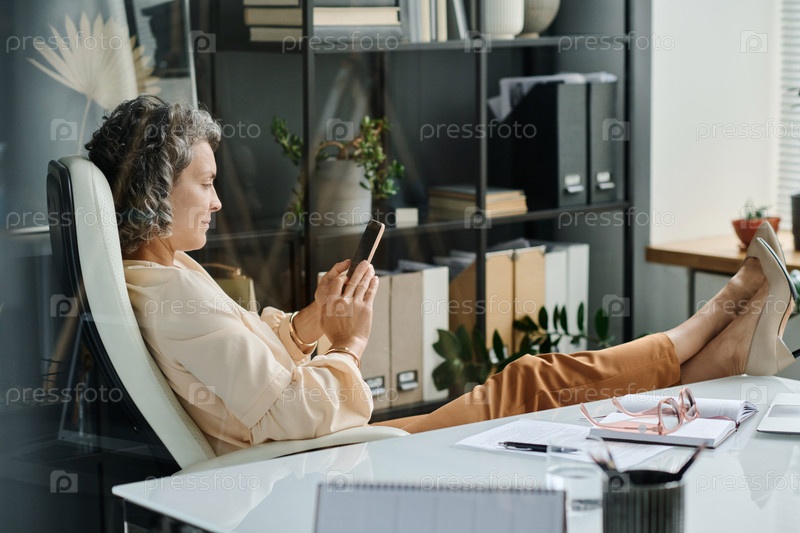Боковой вид зрелой расслабленной предпринимательницы, сидящей в кресле