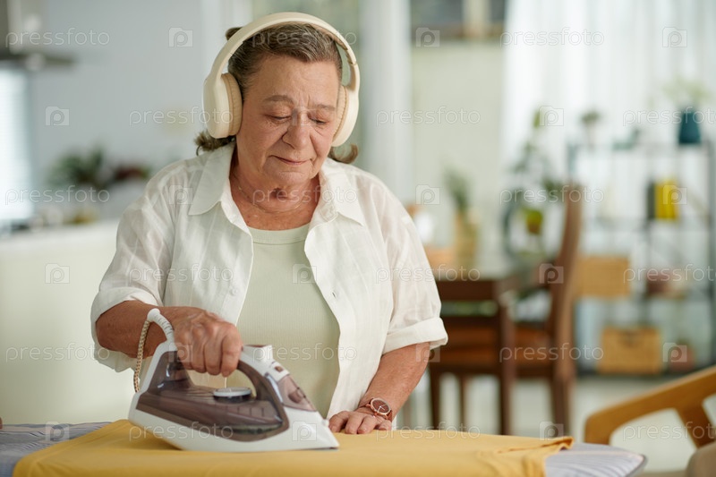 Старшая женщина в наушниках гладит