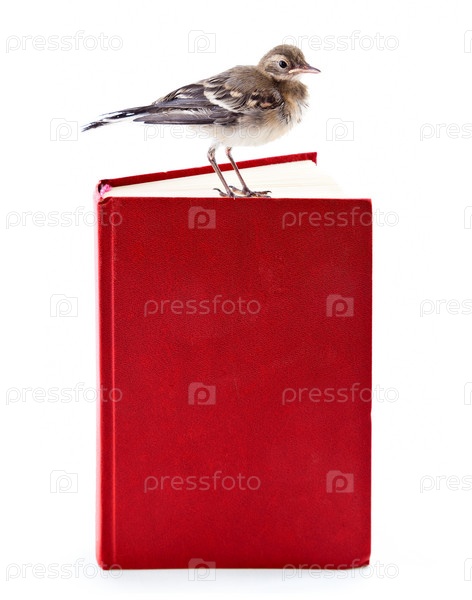Птенец на красной книге на белом фоне